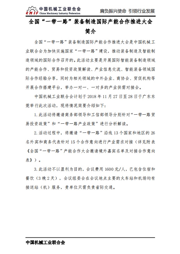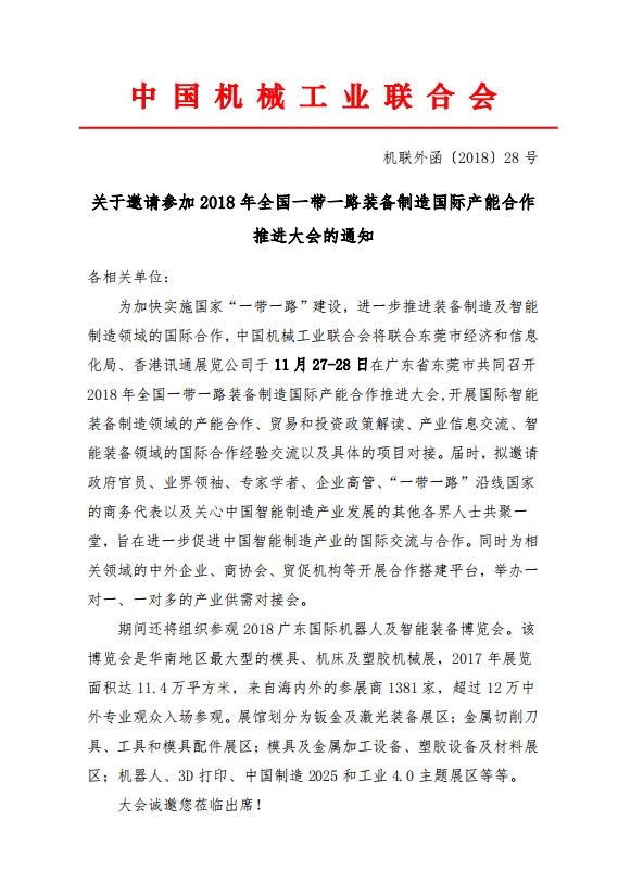转发关于邀请参加2018年全国一带一路装备制造国际产能合作推进大会的通知