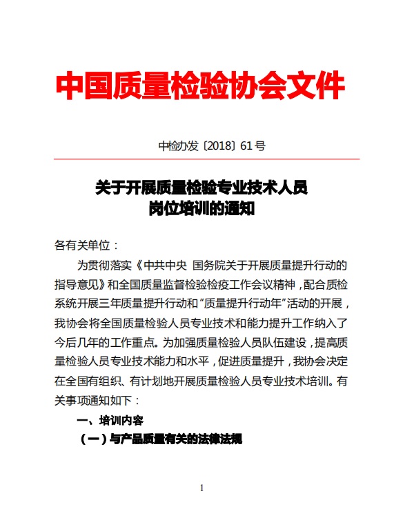 转发关于开展质量检验专业技术人员岗位培训的通知