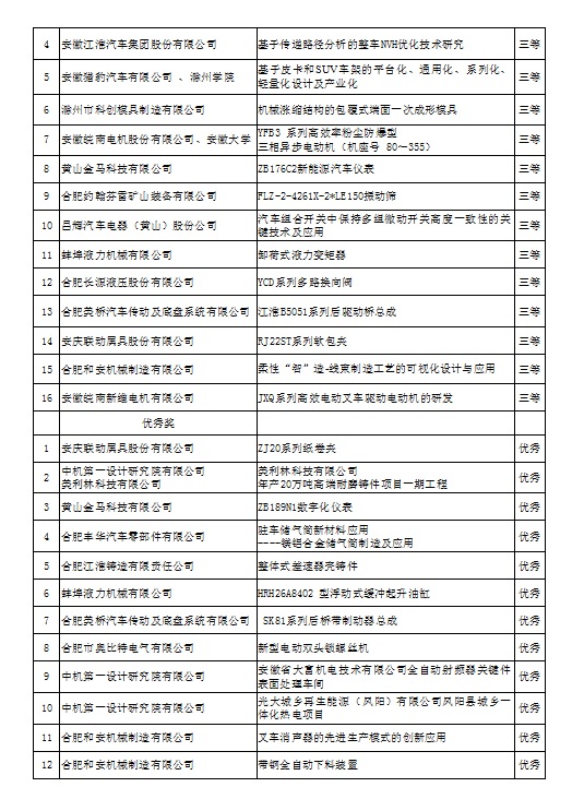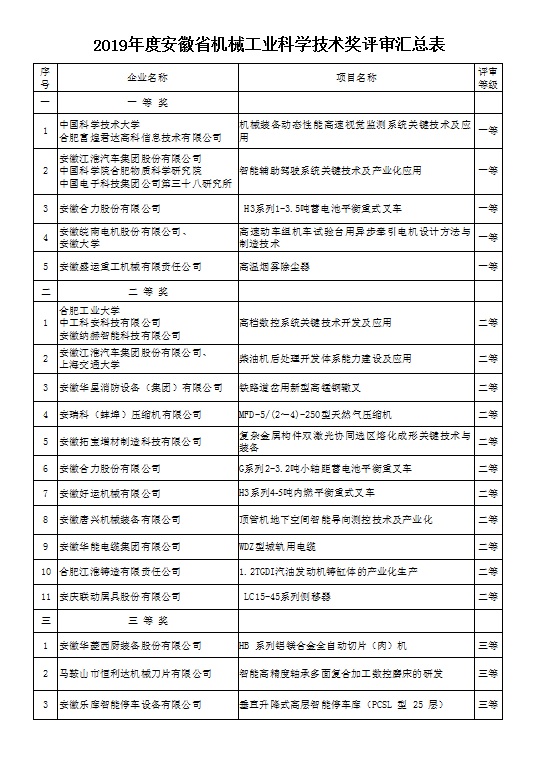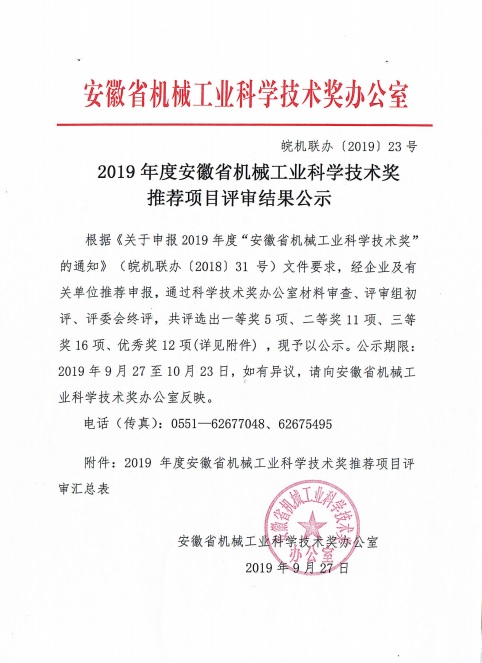 2019年度安徽省机械工业科学技术奖推荐项目评审结果公示