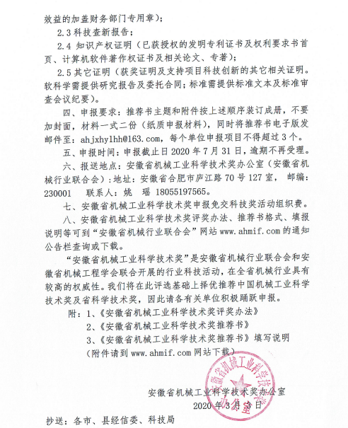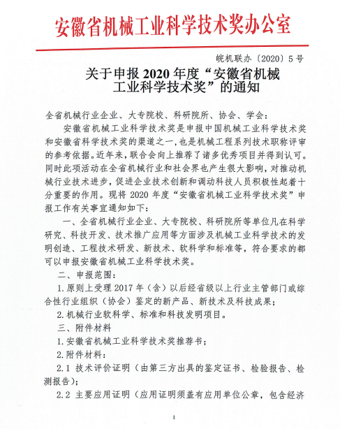 关于申报2020年度“安徽省机械工业科学技术奖”的通知