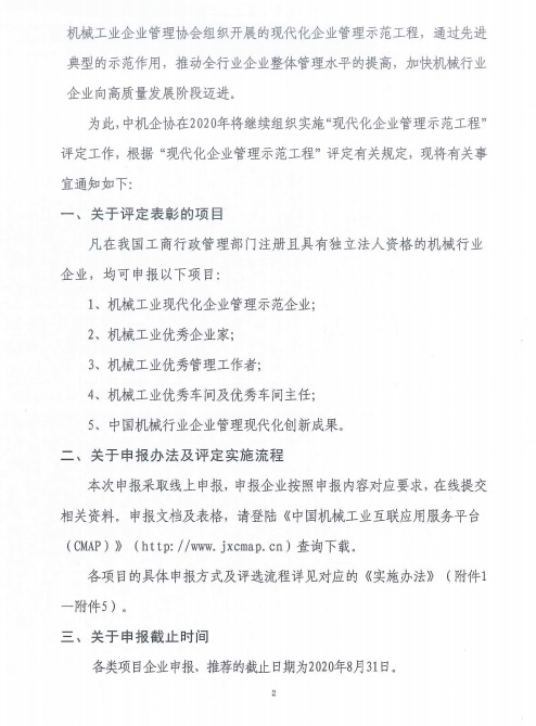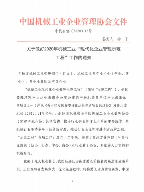 转发关于做好2020年机械行业“现代化企业管理示范工程”工作的通知