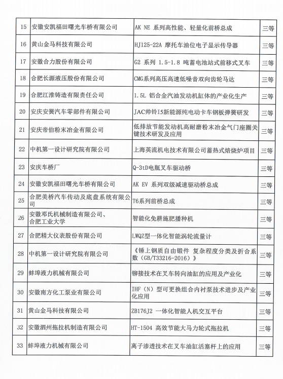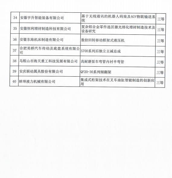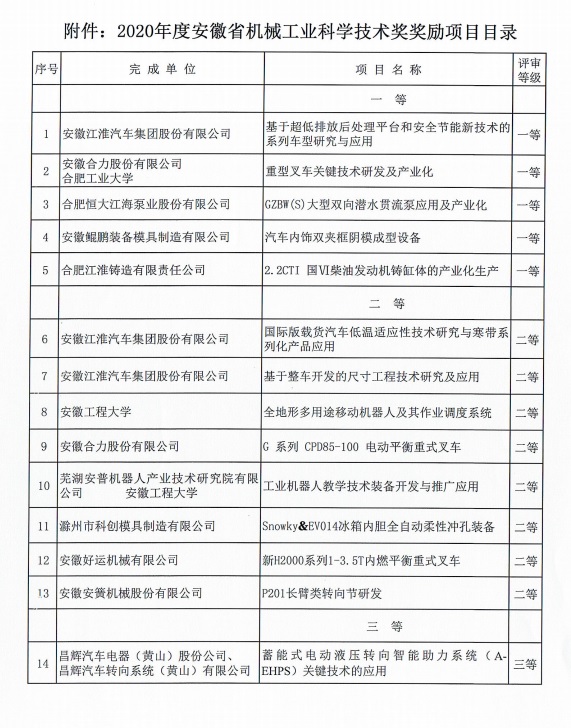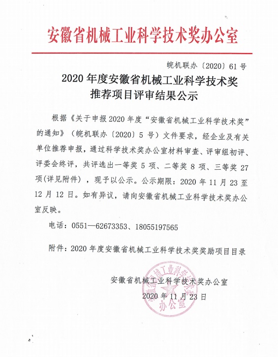 2020年度安徽省机械工业科学技术奖推荐项目评审结果公示