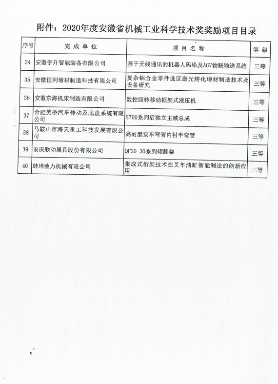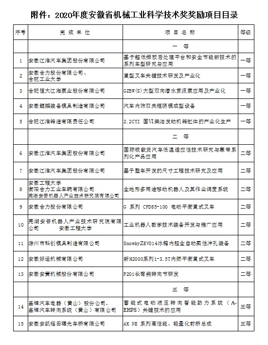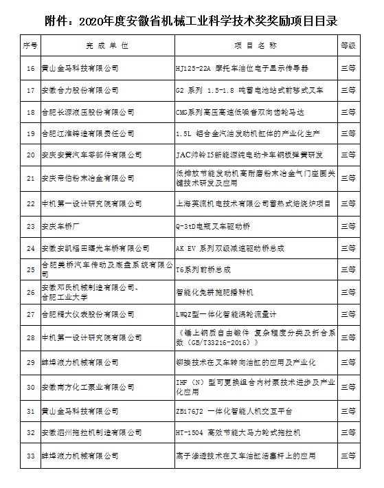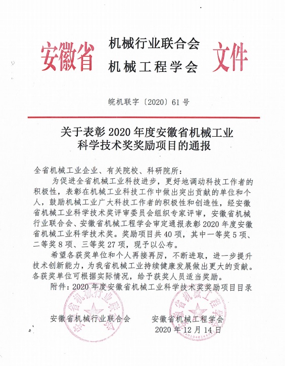 关于表彰2020年度安徽省机械工业科学技术奖奖励项目的通报